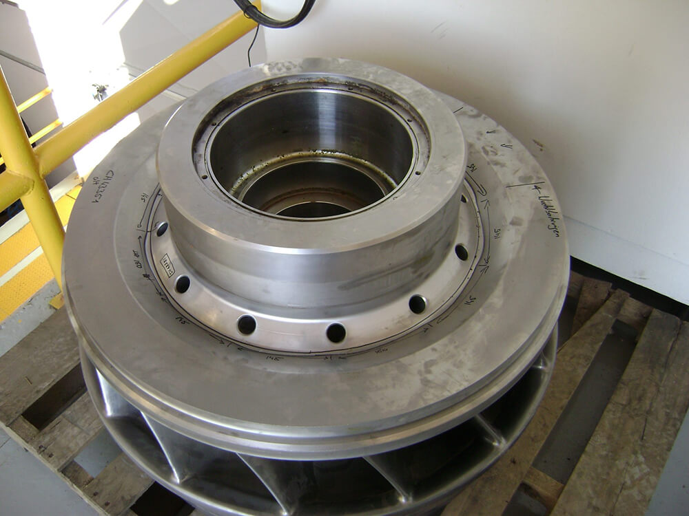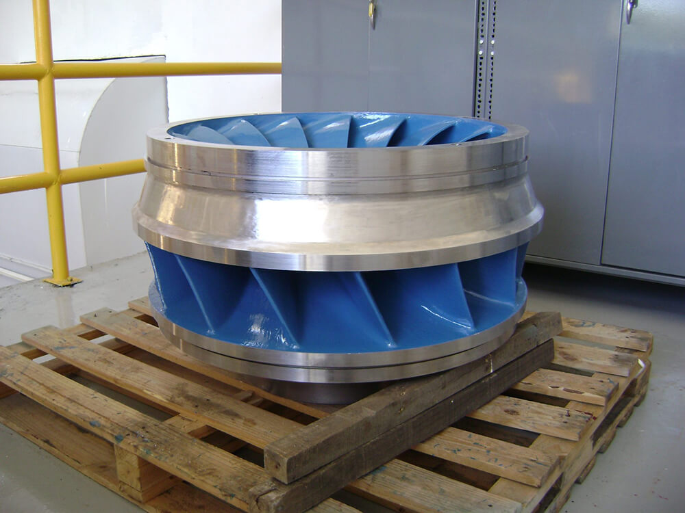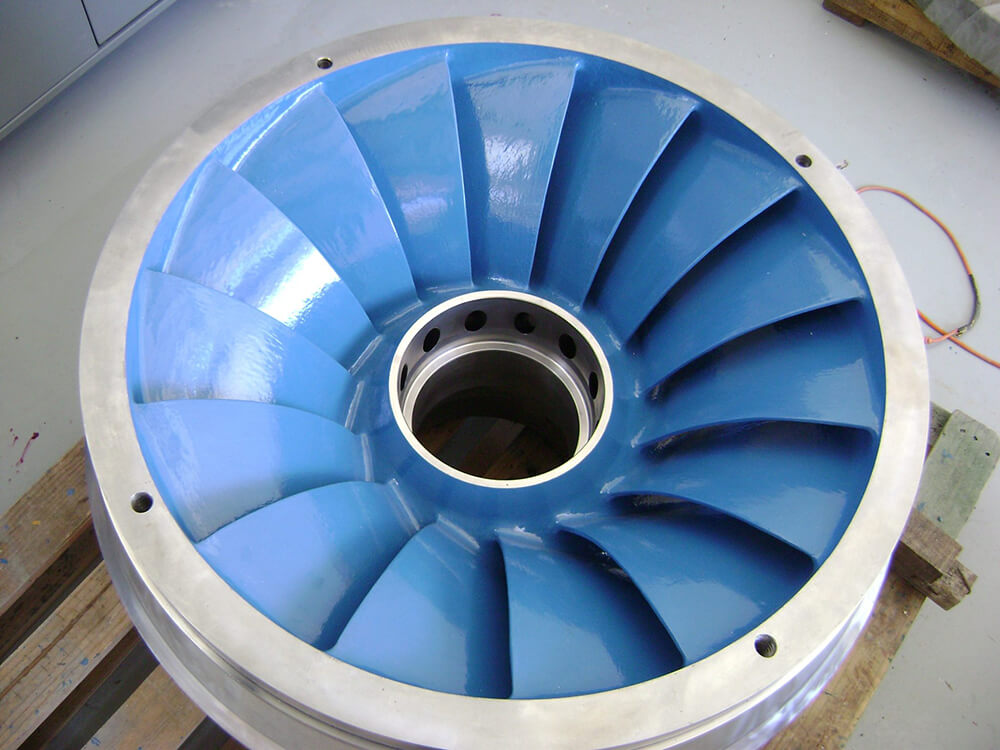 La superficie del rodete de turbina Francis es preparada por medio de granallado a un perfil de rugosidad de 75 micras, permitiendo una situación óptima de anclaje para el revestimiento a aplicar.