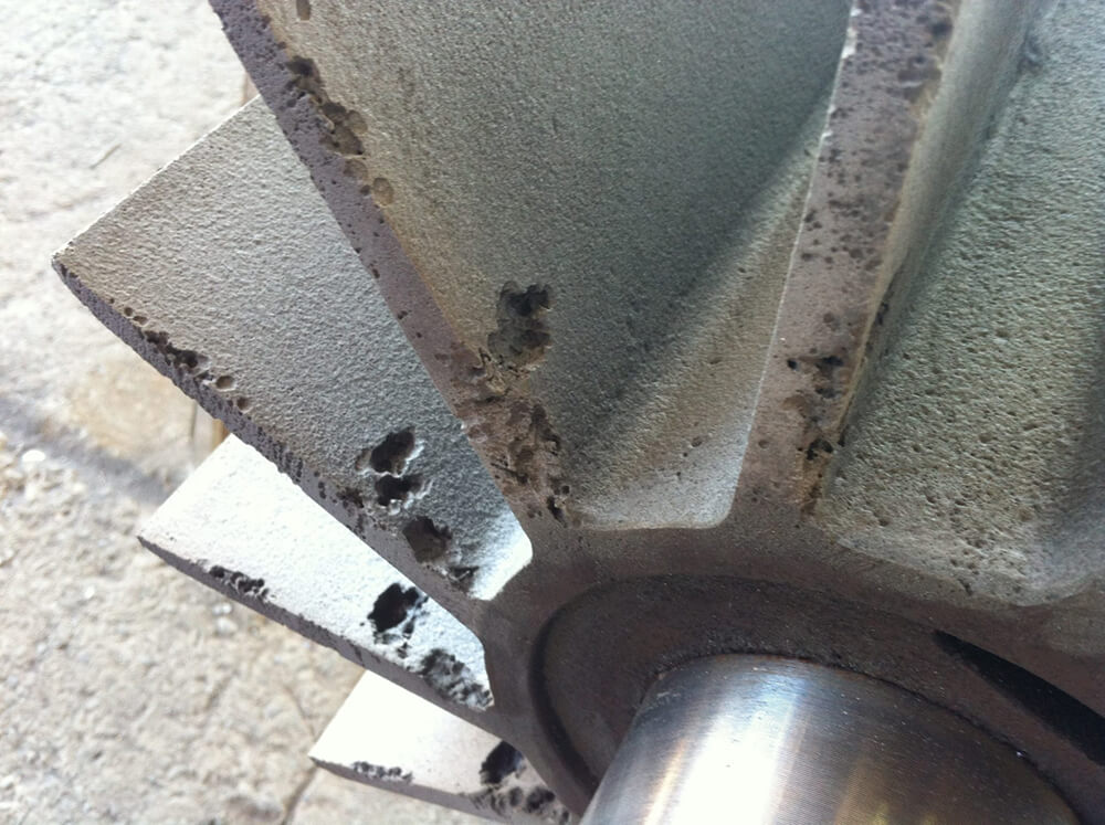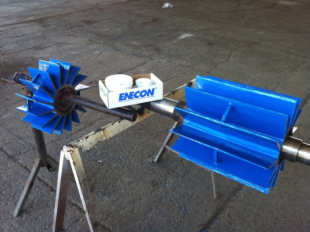 El impulsor presentaba un avanzado estado de corrosión y presencia de “pitting” en los bordes de los álabes. La solución dada por ENECON fue volver a la geometría original usando CeramAlloy CP+AC en pasta y finalmente aplicar CeramAlloy CL+AC gris como primera capa y CeramAlloy CL+AC azul como capa final, extendiendo significativamente la vida útil del impulsor.